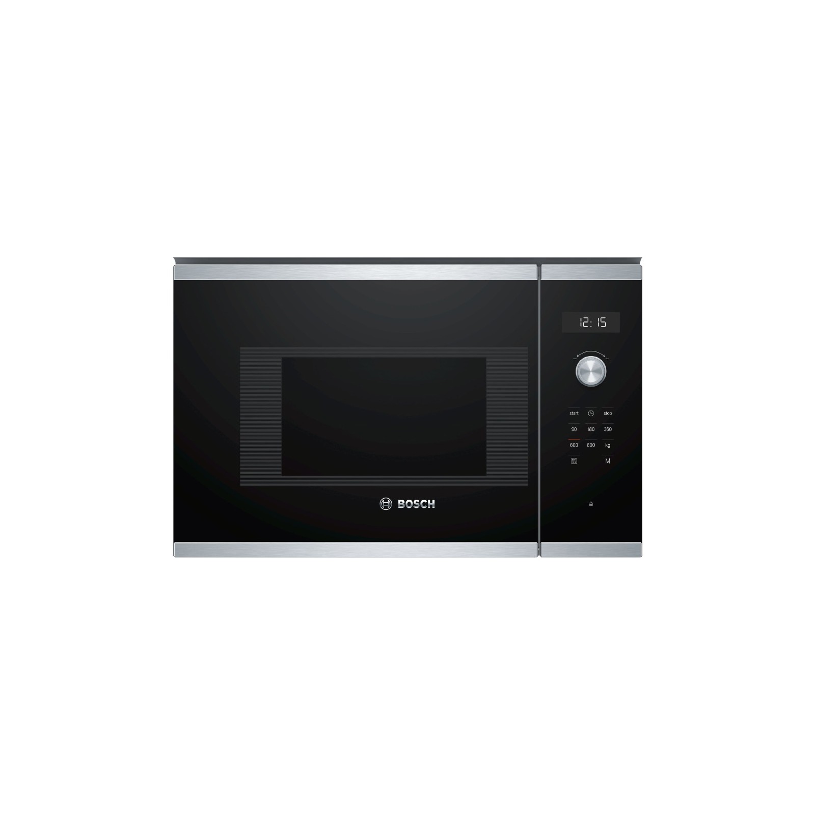 مایکروویو بوش مدل BFL524MS0 دارای سیستم کاربر پسند با دکمههای فشاری و کنترل بازشو بوده و دارای عملکرد حافظه و نمایشگر ساعت دیجیتال نیز میباشد.